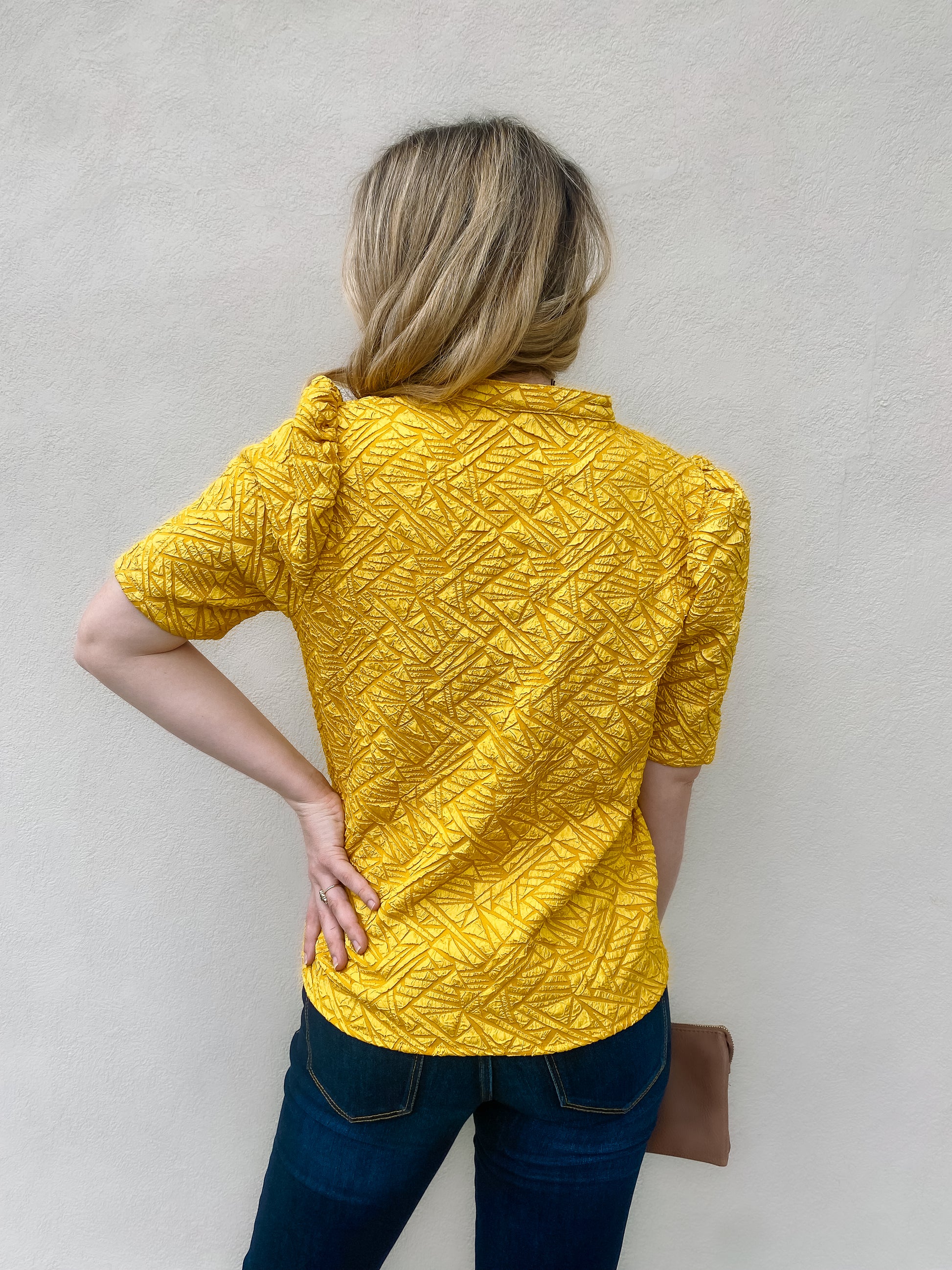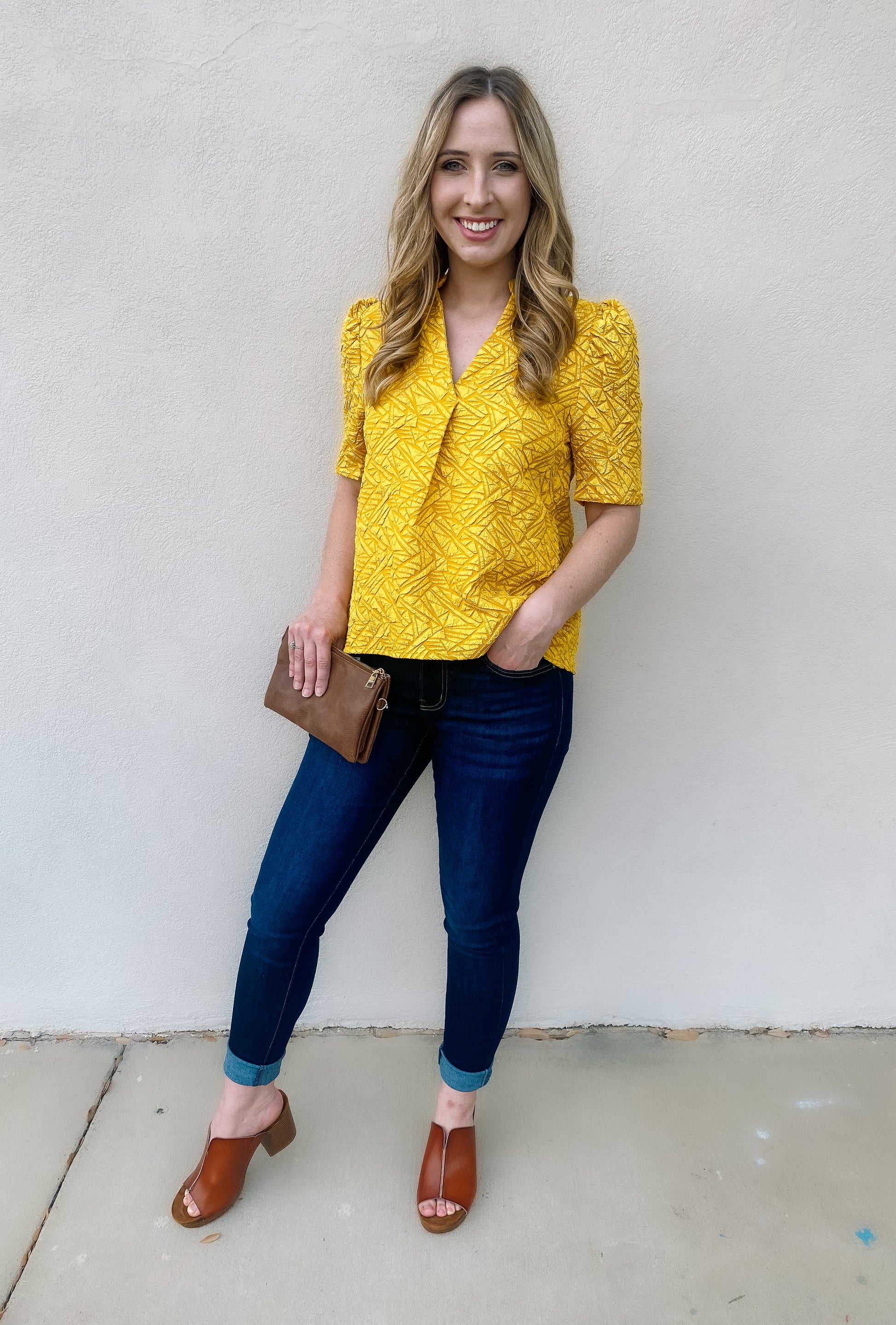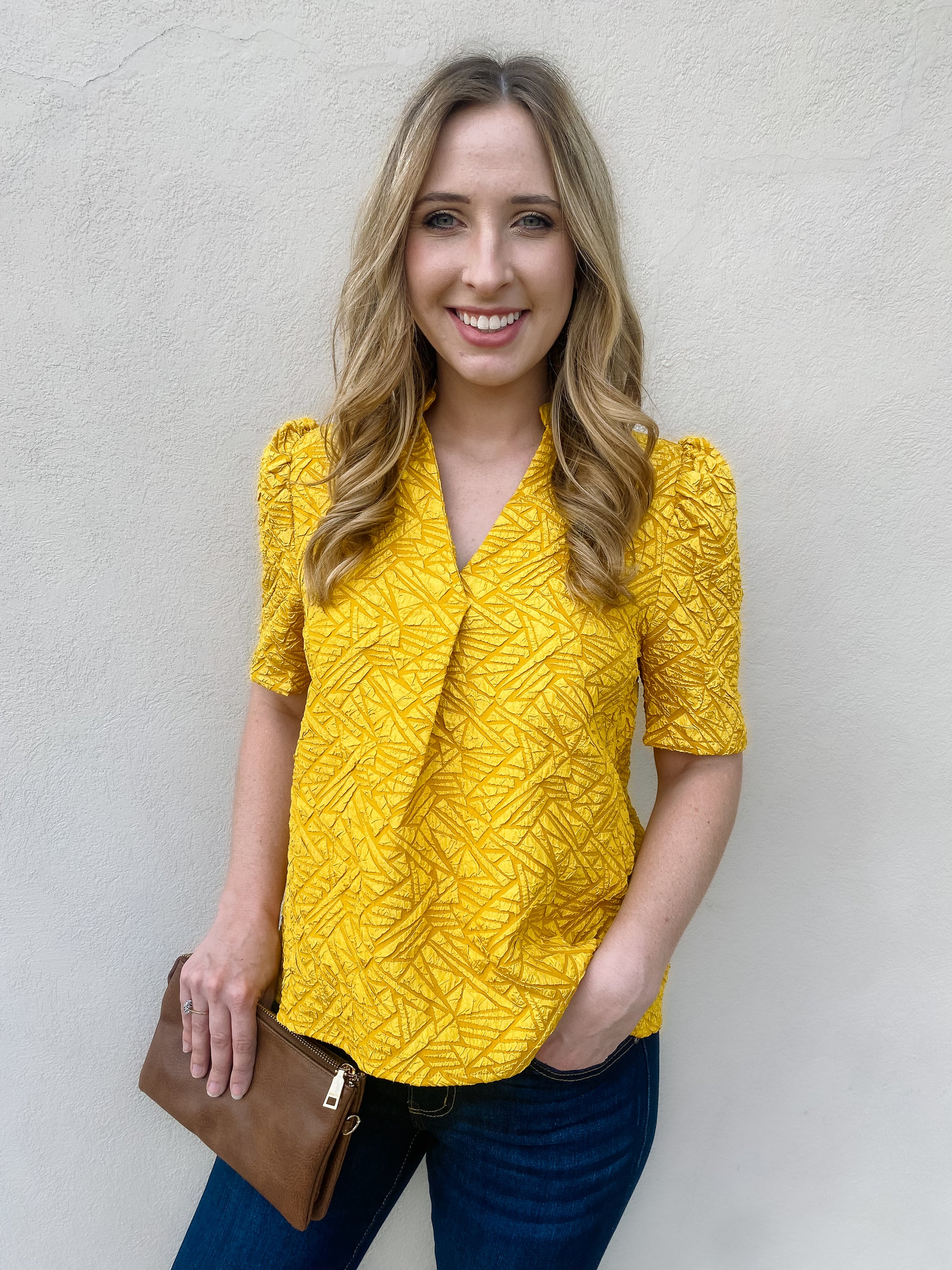 The Kylie Top features a subtle v-neckline, short sleeves, and stunning texture. This beautiful mustard textured top is perfect for a day in the office! Style with your favorite denim or dress pants, flats or wedges and your everyday accessories.