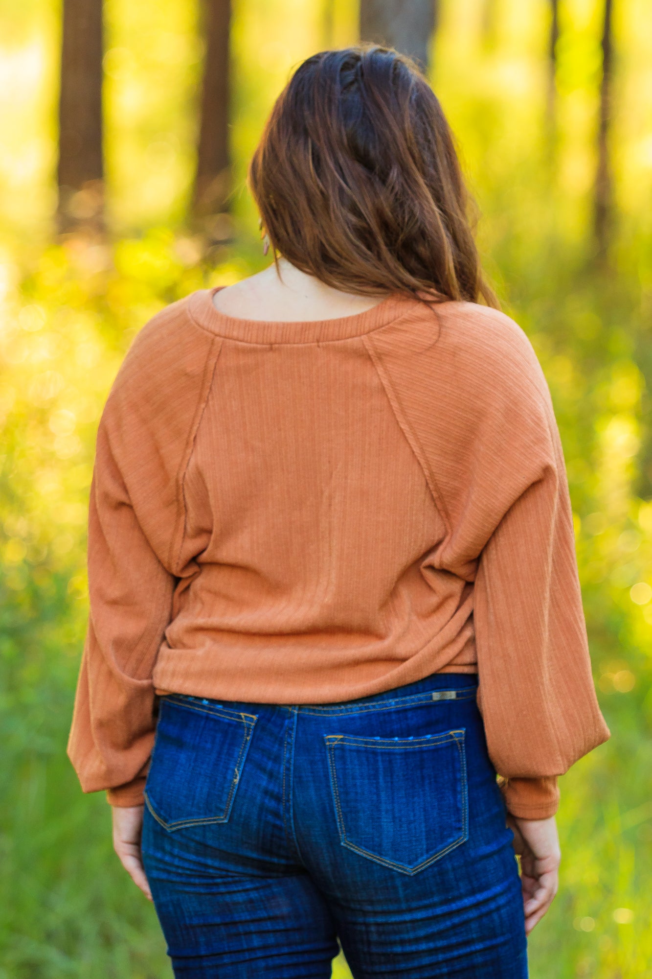 The Lexi Top is long sleeved with a V neckline. It is SO soft and PERFECT for the Fall weather! It is 95% Polyester and 5% Spandex. We suggest to wash in cold water, and lay flat to dry.