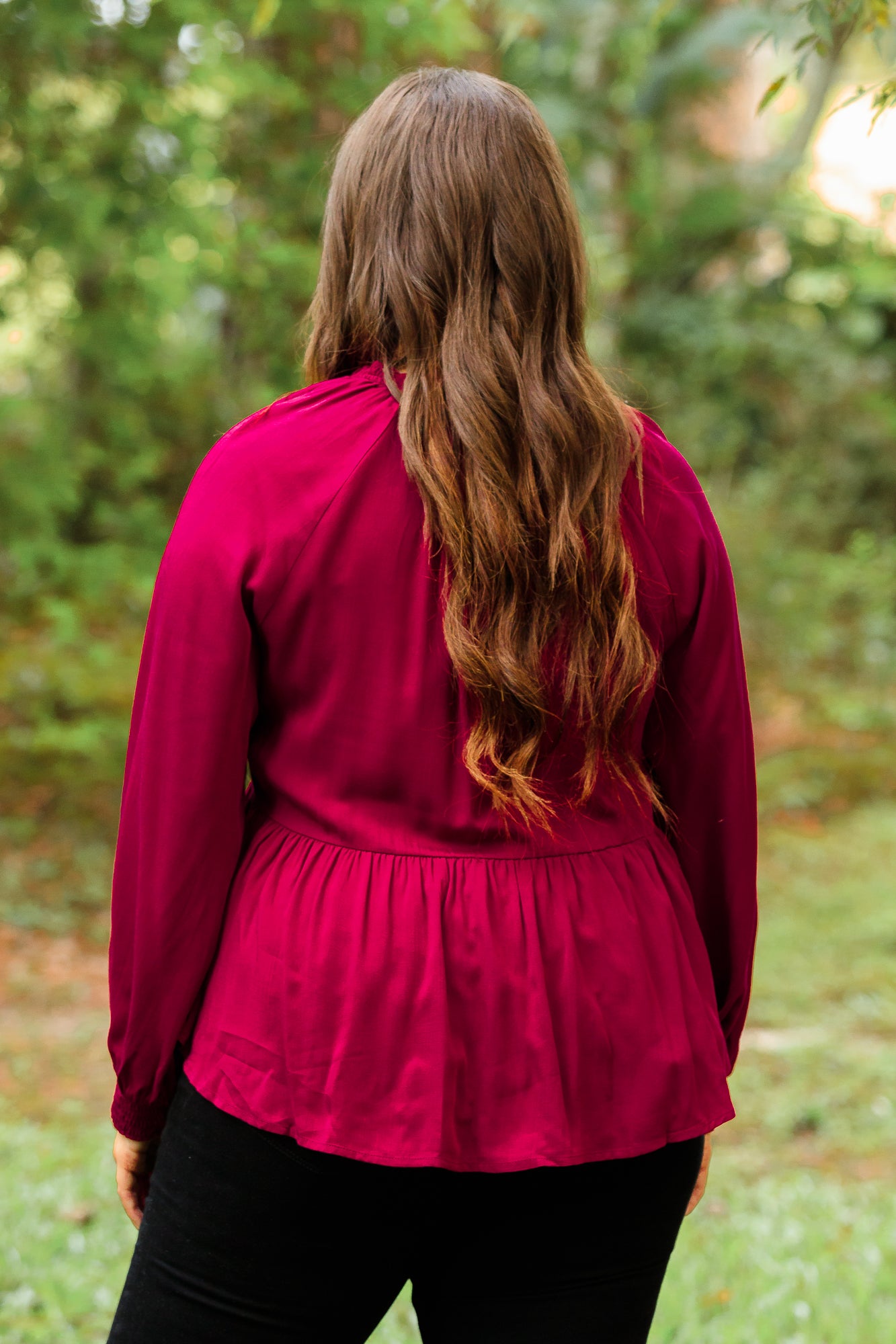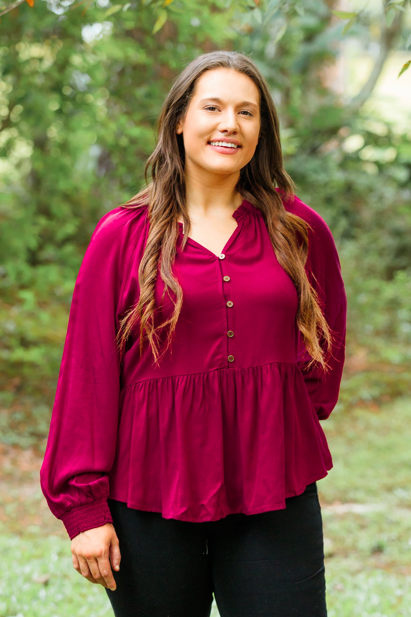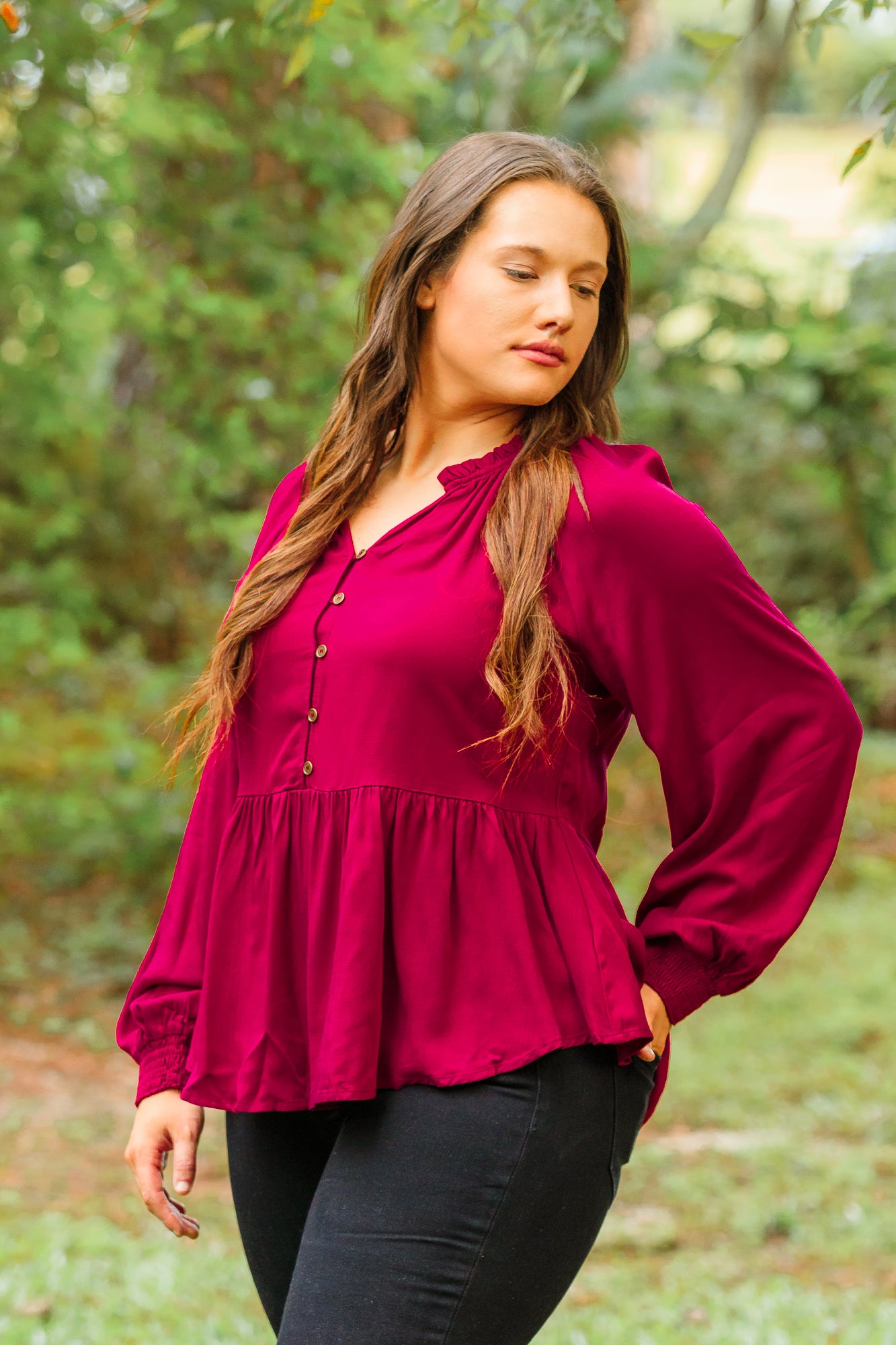 The Maverick Top is a long sleeved burgundy colored top! It has a button detail down the front. It also has a tiered design. It has a ruffled neckline. The Maverick Top is 100% Rayon. We suggest to hand wash in cold water, and lay flat to dry.