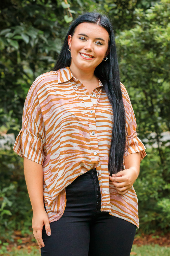 The Nova Top is a short sleeved, zebra patterned top! It has a collared neckline. It also has buttons down the front. the Nova Top also features cut outs on the sleeves. It is 100% Rayon. We suggest to hand wash in cold water, and lay flat to dry.