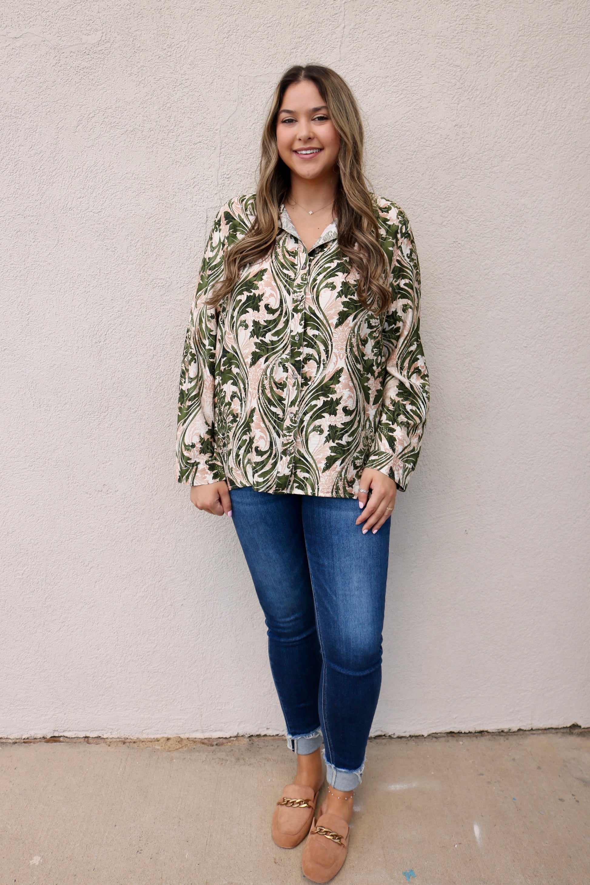 Chic and timeless, this printed blouse features a button front design with a relaxed fit and silky soft feel. The olive and cream scroll print adds a touch of sophistication, making it perfect for dressing up denim or pairing with trousers for work or dinner.