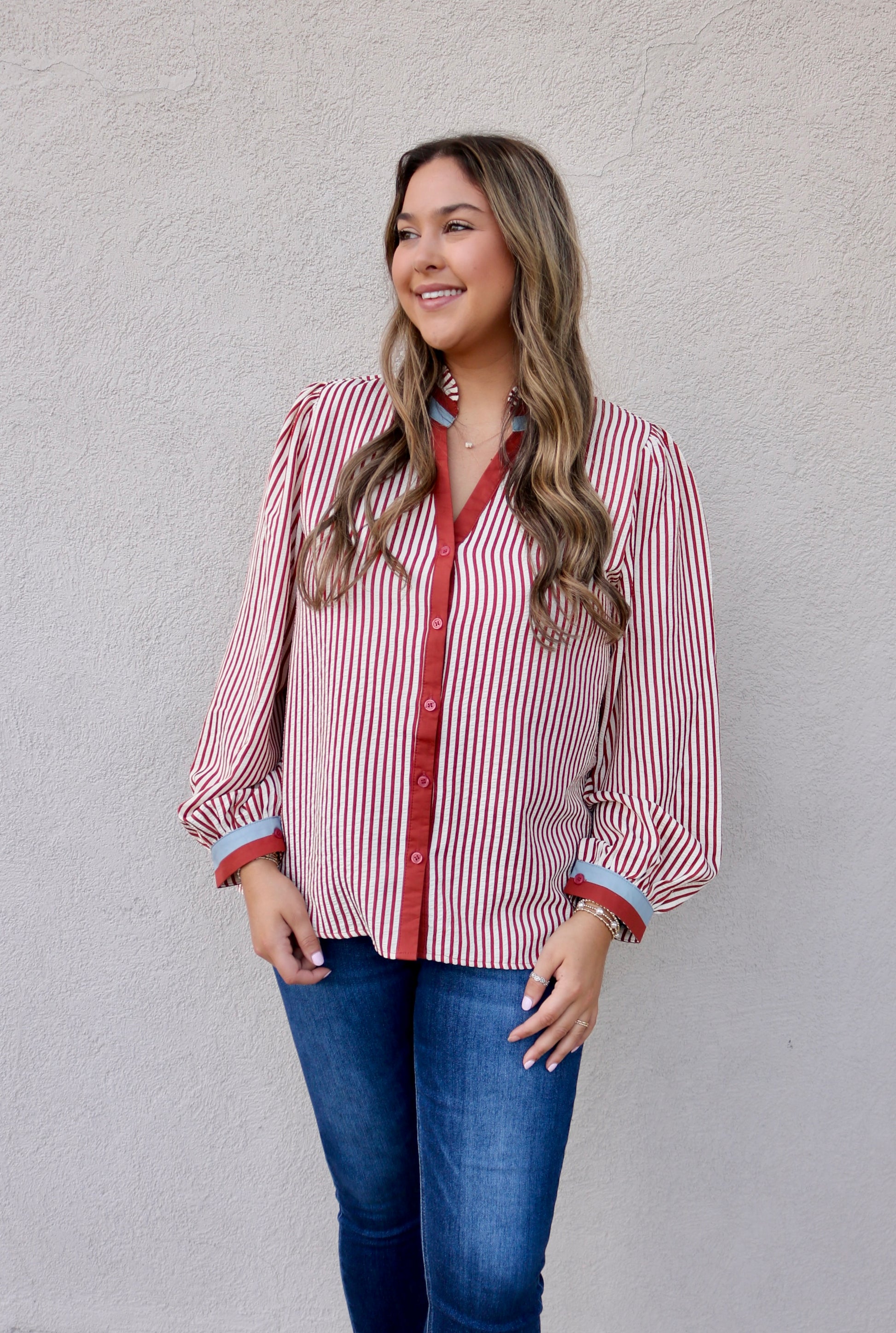 Classic with a fun pop of contrast — this striped blouse features a button-front design, balloon sleeves with contrast cuffs, and a relaxed fit that’s perfect for dressing up or keeping it casual. Lightweight and breathable, it’s an effortless closet staple you'll reach for year-round.