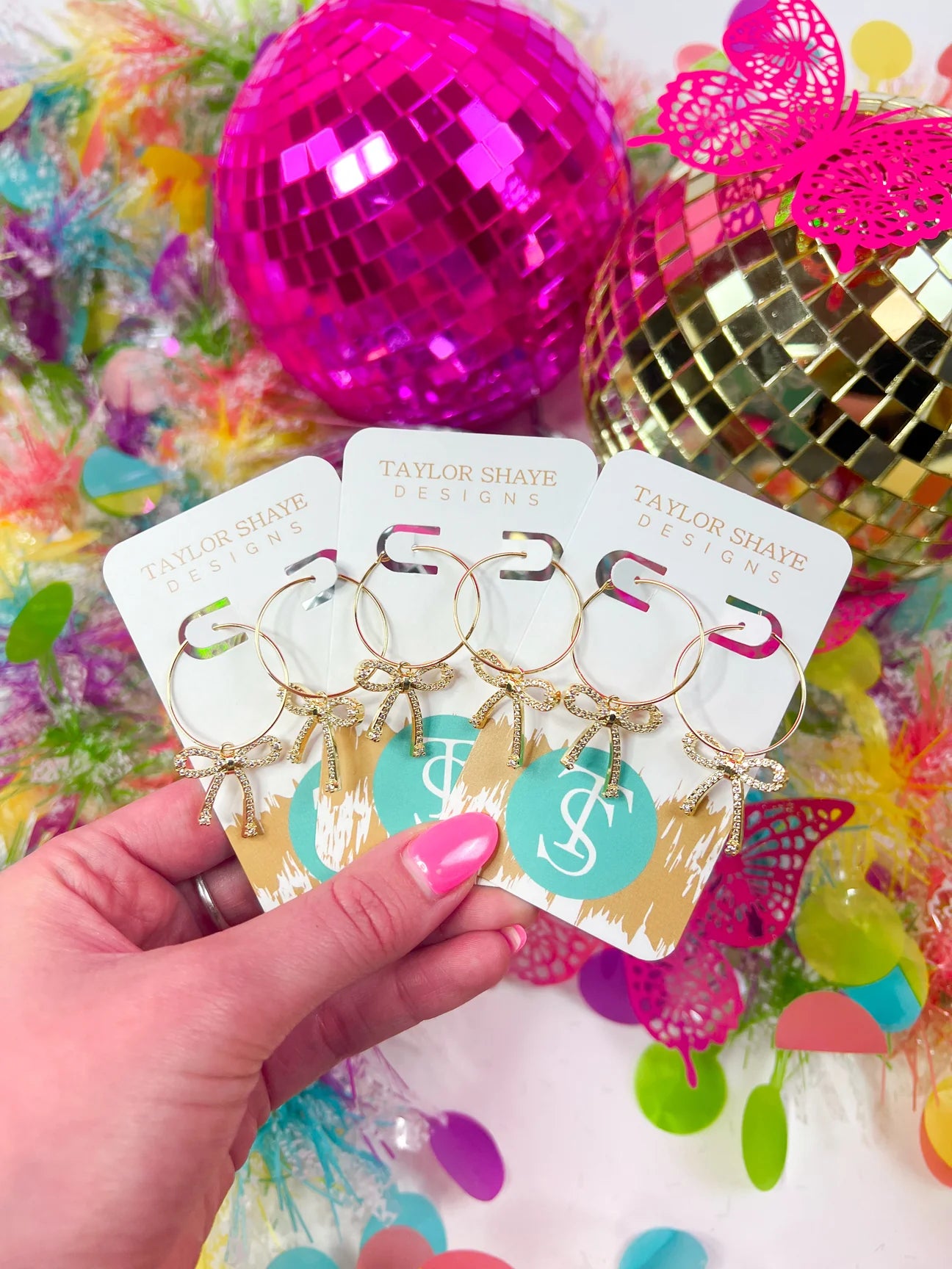 Add a playful touch of sparkle with these gorgeous Taylor Shaye bow hoop earrings ✨ Featuring a delicate gold hoop paired with a rhinestone-encrusted bow charm, this style blends elegance with fun — perfect for dressing up everyday looks or adding a chic accent to special occasions.